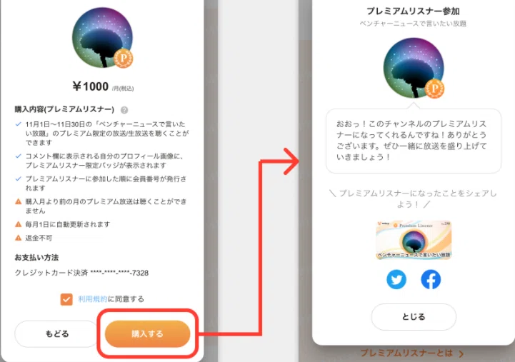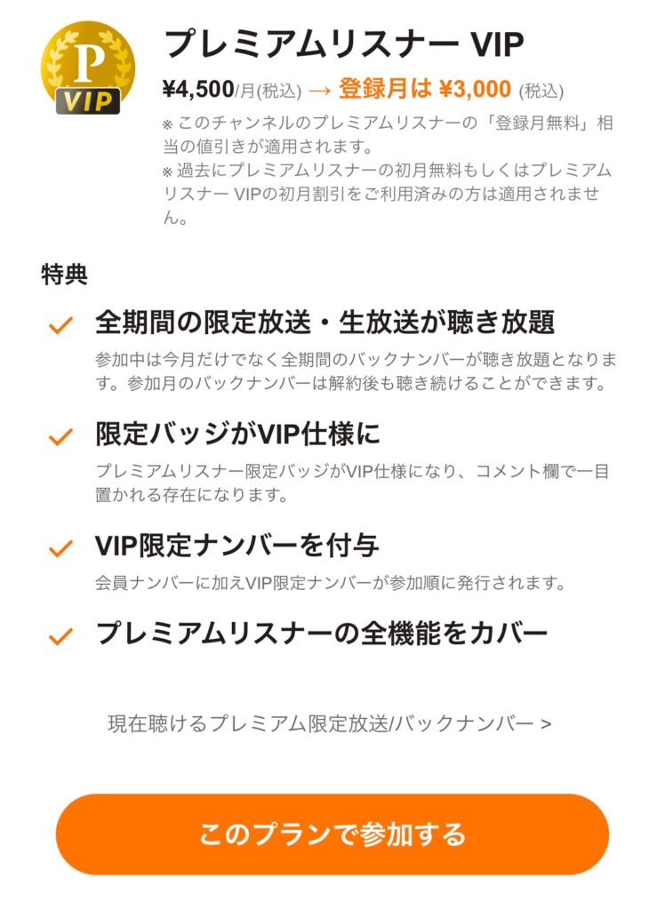 ※すでにプレミアムリスナーとして参加している方は、VIPにアップグレードできます。その際、プレミアムリスナーとの差額分が請求されます。