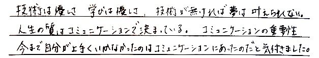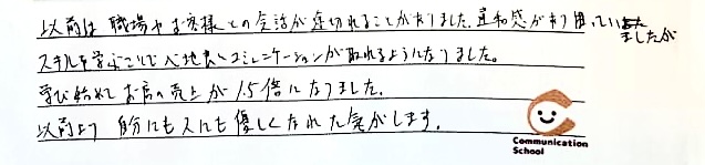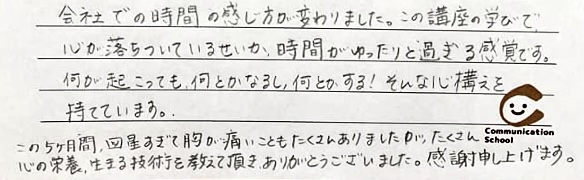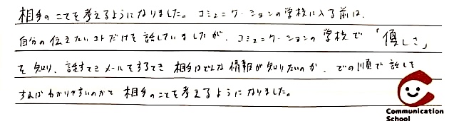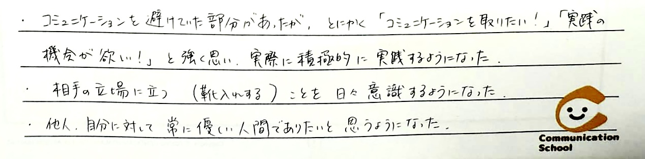 優しくなるというマインドが学べるところががコミュニケーションの学校のすごいところだと思います。 なぜなら、今までは自分の事を考えるて、相手の事をまったく考えていなかったので、なんで伝わらないんだろうとイライラしていました。しかし、コミュニケーションの学校で「優しさ」を学び、なぜ伝わらないのかを理解したからか、心に余裕が生まれました。