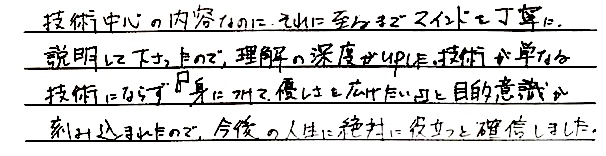 抽象的な優しさという概念をわかりやすく具体化し、現場で優しさを実践できるよう設計されている所が凄い! 優しさマインドをしっかり学べ、さらにその土台の上に使うスキルも学べる。 この2つは現場ですぐに使え、さらに一生深める事もできる。 短期的にも長期的にも受講生の取れ高が高く作られていて素晴らしい!