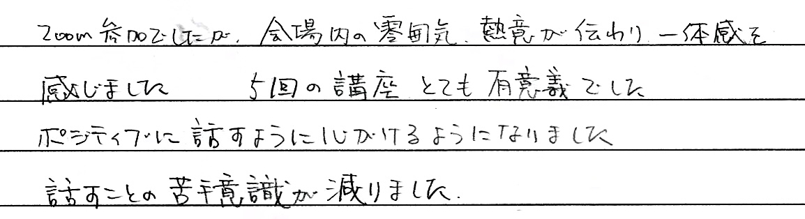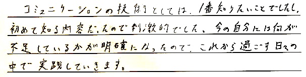 上司への報告や家族との会話での失敗体験から、近年ではコミュニケーションそのものから逃げがちだった自分がいたのですが、鴨さんの講義を聞いているとそれだけで「会話したい、実践したい!」という前向きな心のパワーが湧いてきました。